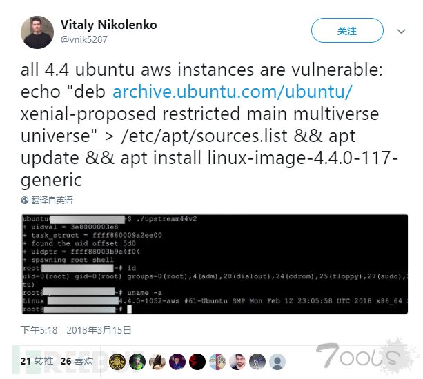 今天下午,Twitter 用户 @Vitaly Nikolenko 发布消息,称 ubuntu 最新版本(Ubuntu 16.04)存在高危的本地提权漏洞,而且推文中还附上了 EXP 下载地址。