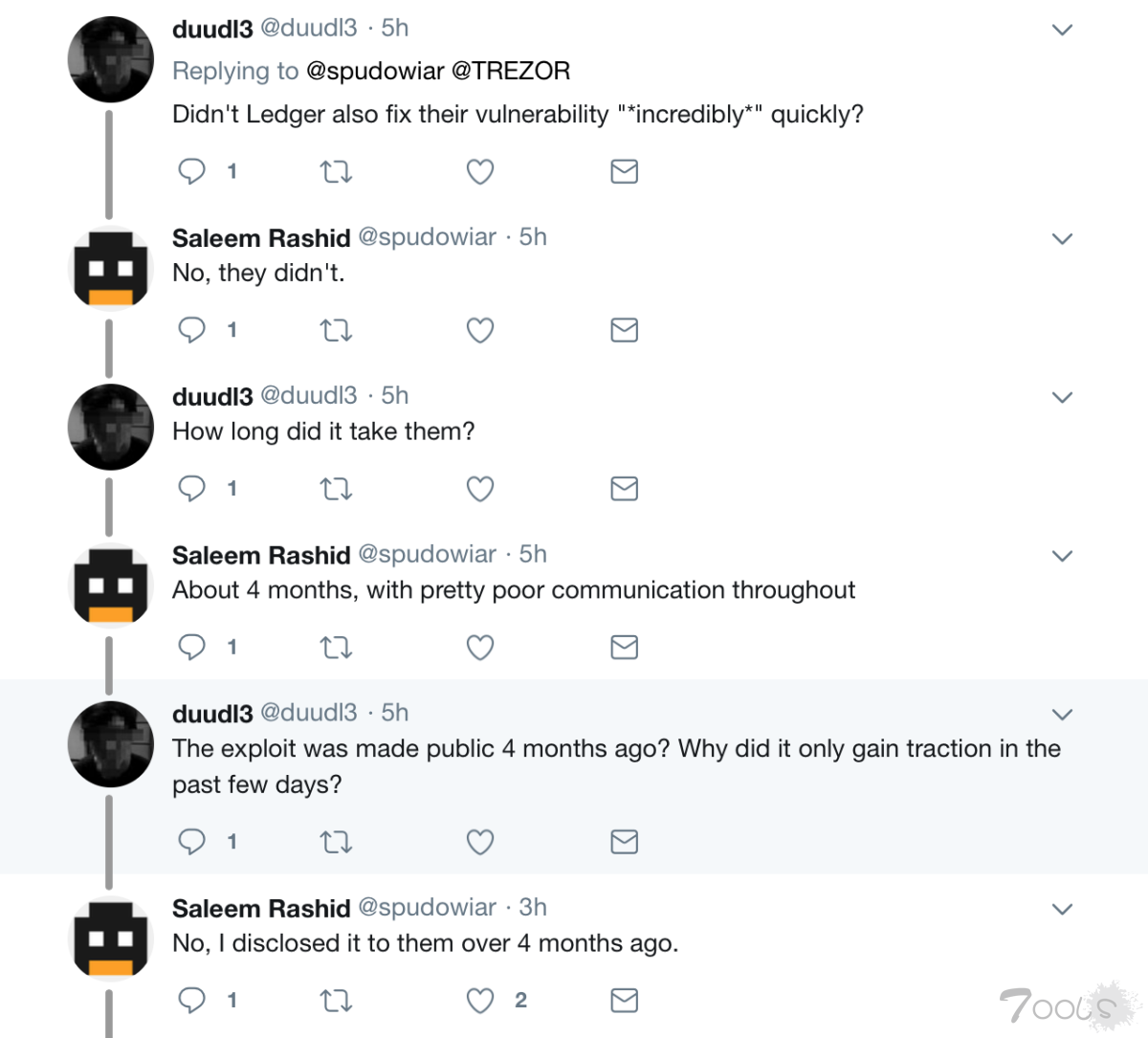 拉希德跟 Ledger 的竞争对手并没有任何直接联系,但也有一些说法称,他为 Trezor 和其他一些硬件钱包竞品做了一些工作。拉希德的回应如下: