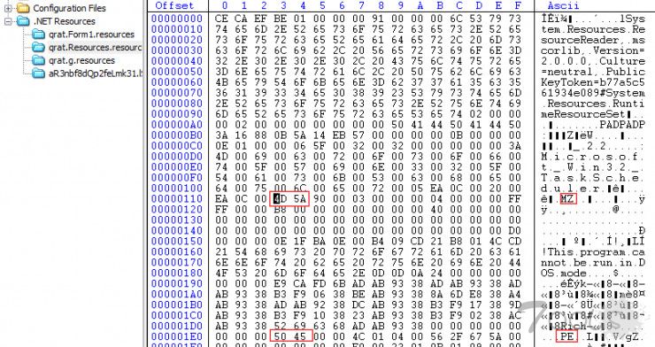 b. 该Droper样本和以往捕获的“白象”样本功能相似,主要是进行木马后门的安装。样本运行后会通过资源先后释放Microsoft.Win32.TaskScheduler.dll和microsoft_network.exe。这两个文件都被存放在qrat.exe的资源中,该段资源包含两个PE文件,最开始的MZ头是后门程序,而第二个MZ头是添加计划任务的dll。通过PE工具可以查看明显的PE文件特征。