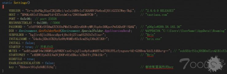a. 样本从编译时间来看是2018年1月23日,同样采用C#编写,也同样做了混淆,去掉混淆后发现该样本为远控木马。木马采用开源远控xRAT的源码编译,一直被“白象”团伙所使用。此次木马在功能能上相比去年12月份的样本,并没有什么功能性的变化,但是对配置文件选项进行了AES加密,并进行了Base64编码。如下图所示: