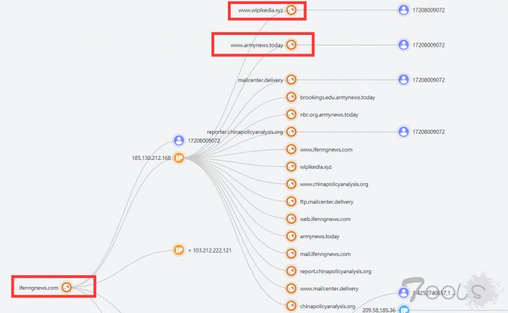 对此次涉及的恶意域名ifenngnews.com、chinapolicyanalysis.org关联发现,除datapeople-cn.com、sinamilnews.com、ustc-cn.org等大批我们此前已经掌握该团伙资产外,我们还发现了包括wipikedia.xyz、armynews.today等多个于2018年1月19日最新注册的可疑域名,从域名注册商、服务器信息等特点研判认为,这些域名仍为“白象”团伙所有,如下图所示: