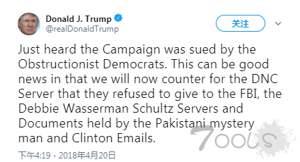 周五特朗普特地就这起诉讼发表了推文:“刚才听说竞选团队被蓄意阻挠的民主党人起诉。”特朗普补充说这是“好消息”,因为被告现在可以通过访问 DNC 服务器和前 DNC 女主席 Debbie Wasserman Schultz 邮件等其他文件进行“反击”。