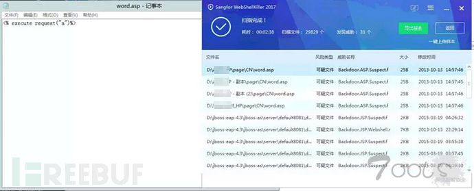 与预想的一致,该企业确实有一台对外的Web服务器,而其它的服务器都处在内网环境。安全团队从此台Web服务器入手,使用EDR WebShell查杀工具进行扫描,发现了大量的网页木马。