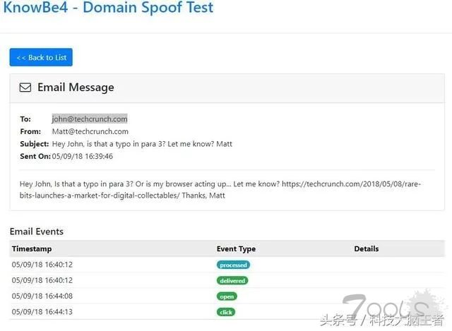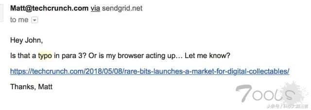斯约维曼指出,反钓鱼教育非常重要,如果受害者对网络安全以及点击电子邮箱中某个恶意链接的危险性了如指掌的话,诸如此类的黑客攻击是不可能完成的。为了验证这一点,斯约维曼给我发了一封电子邮件,看上去好像是我的同事发来的,内容是讨论某篇文章中的错别字。但其实发件人并不是我同事本人,是用 Sendgrid(一个群发邮件服务)仿造的假收件人地址。而且这个连接看似是 TechCrunch,实际上是 Sendgrid 的链接。演示里他们好心地给我跳转到了正牌网站,但是在网络黑产那里就没这样的好事了,任何更加恶劣的情况都有可能发生。