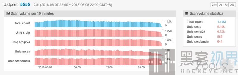 通过来自Rapid7项目Heisenberg的威胁情报数据和GreyNoise intelligence的数据,我们可以看到,针对TCP端口5555的扫描量在2018年2月1日大幅增加。