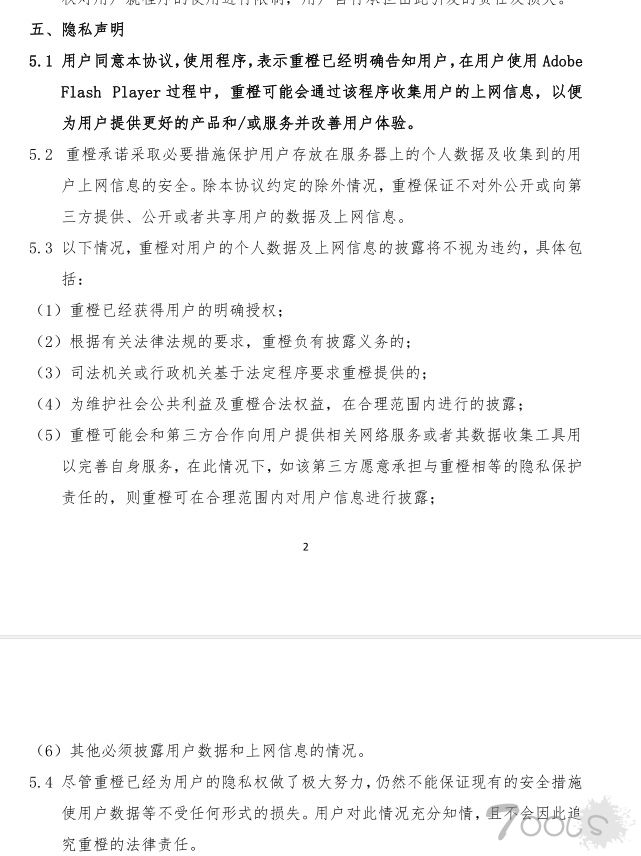 在Adobe Flash Player官网上找到了特供版的用户协议,下载地址在这里,简单截取其中的一部分内容来看,特别是用户隐私部分,重橙网络明确表示可能会搜集用户上网信息,可以在合理范围内将信息披露给第三方,万一出现用户隐私数据安全不能保证的情况,用户也不能追究重橙网络的责任。