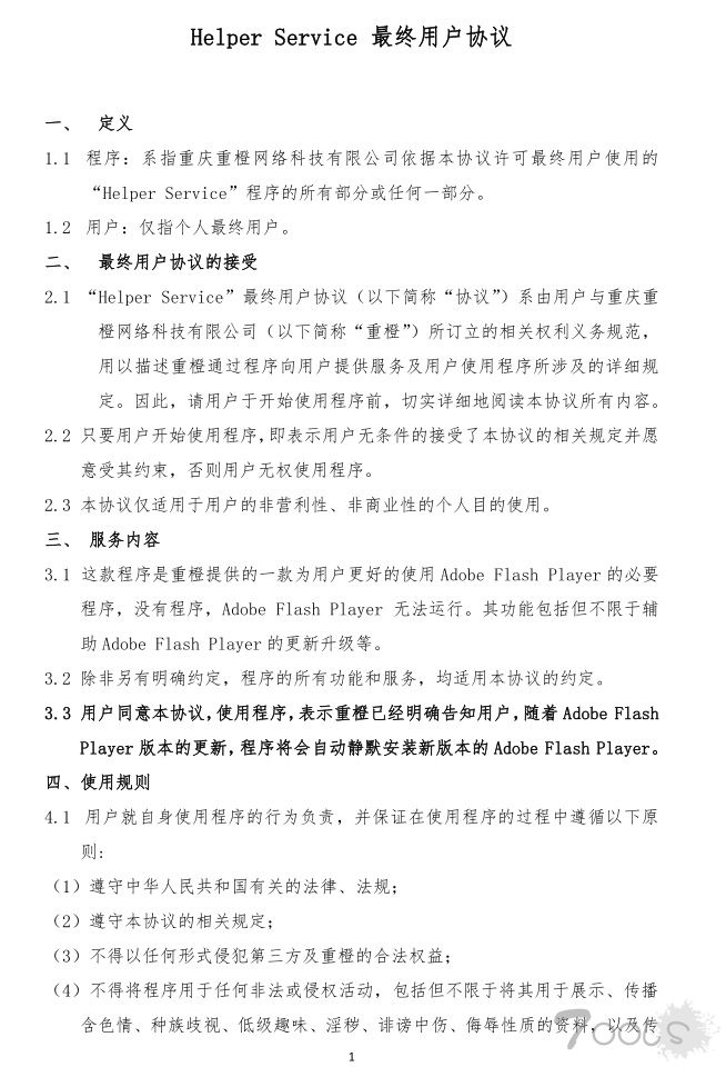 这么执着地让中国用户使用特供版Adobe Flash Player到底有什么缘由呢?这事也被人扒皮了,Adobe Flash Player国内特供版是跟重庆一家名为重橙网络科技有限公司合作的,安装后会常驻FlashHelperService服务,而他们的用户协议中就直接说明了FlashHelperService服务会搜集用户的上网信息。