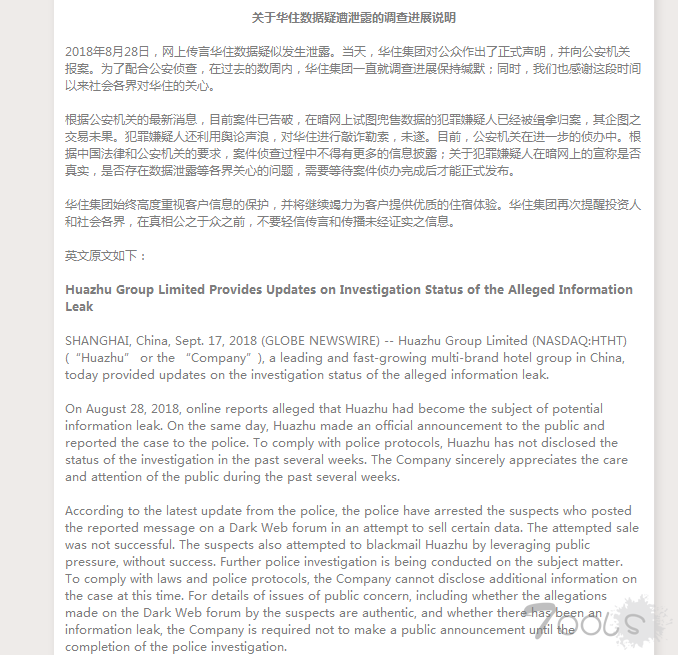 9月17日,华住集团在美国证券市场发布了“关于华住数据疑遭泄露的调查进展说明”。说明称,2018年8月28日,网上传言华住数据疑似发生泄露。当天,华住集团对公众作出了正式声明,并向公安机关报案。根据公安机关的最新消息,目前案件已告破,在暗网上试图兜售数据的犯罪嫌疑人已经被缉拿归案,其企图之交易未果。