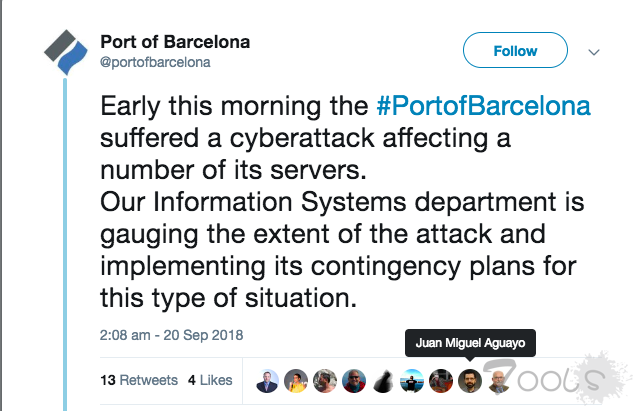 今天凌晨,#PortofBarcelona遭遇了一次网络攻击,影响了它的许多服务器。