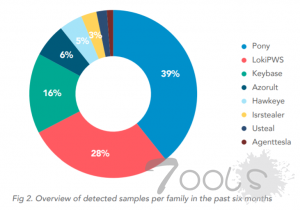 然而有意思的是,Blueliv的最新分析显示,LokiPWS(又名Lokibot)恶意软件家族分布的增速快于Pony。早在5月份,Pony和LokiPWS均在最活跃的恶意软件之列,而且Pony的数量领先于其他恶意软件。当时,LokiPWS恶意软件数量在过去的12个月中增长超过300%。现在,LokiPWS的样本量几乎翻了一番,比上一季度增加了91%,并且正在缩小与Pony的数量差距。