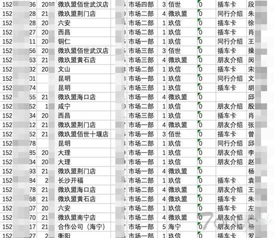 而第二份数据,孤狼号称是“玖融网的内部渠道数据”,显示了每一笔业务的客户来源、门店信息等内容。
