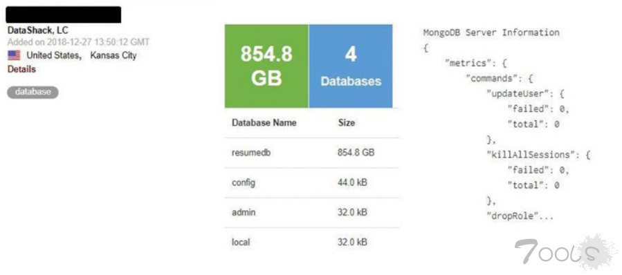 未受保护的854.8千兆字节的数据库存储在MongoDB的实例中,这是一个NoSQL高性能和跨平台的面向文档的数据库,由美国服务器托管公司托管。