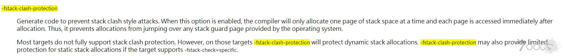 GCC 中的 -fstack-clash-protection 选项用于生成代码以防止堆栈冲突样式攻击(stack clash style attacks),启用此选项后,编译器将一次只分配一页堆栈空间,并在分配后立即访问每个页面。因此,它可以防止分配跳过处于操作系统保护下的任何堆栈页面。