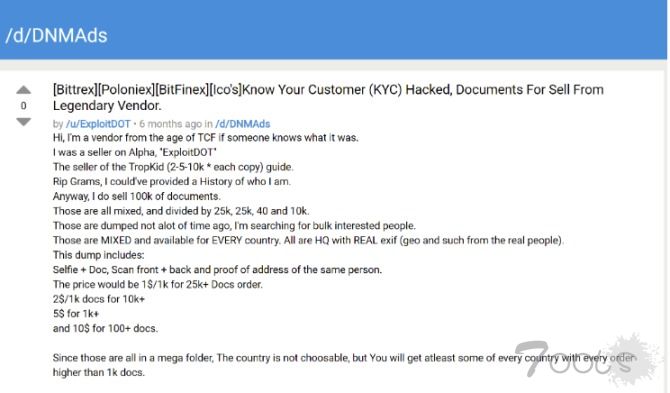 一个名为“Dread”的黑暗市场上,一个名为“ExploitDOT”的用户试图出售从大多数交易所中道来的客户KYC资料。