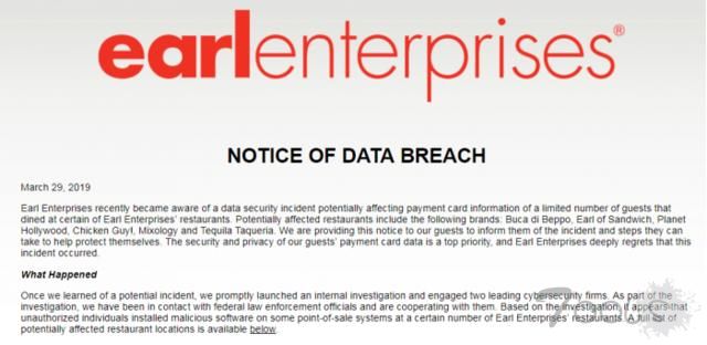 Earl Enterprises表示,入侵事件发生在2018年5月23日和2019年3月18日之间,并且“事件现已被控制。”这次入侵事件影响了 Buca di Beppo、 Earl of Sandwich、 Planet Hollywood、 Chicken Guy!、 Mixology和Tequila Taqueria等餐厅。该公司已经为客户推出了一个网站,以检查他们去过的餐厅是否是受影响的餐厅之一。该公司还表示,在线订单不会受到入侵的影响。