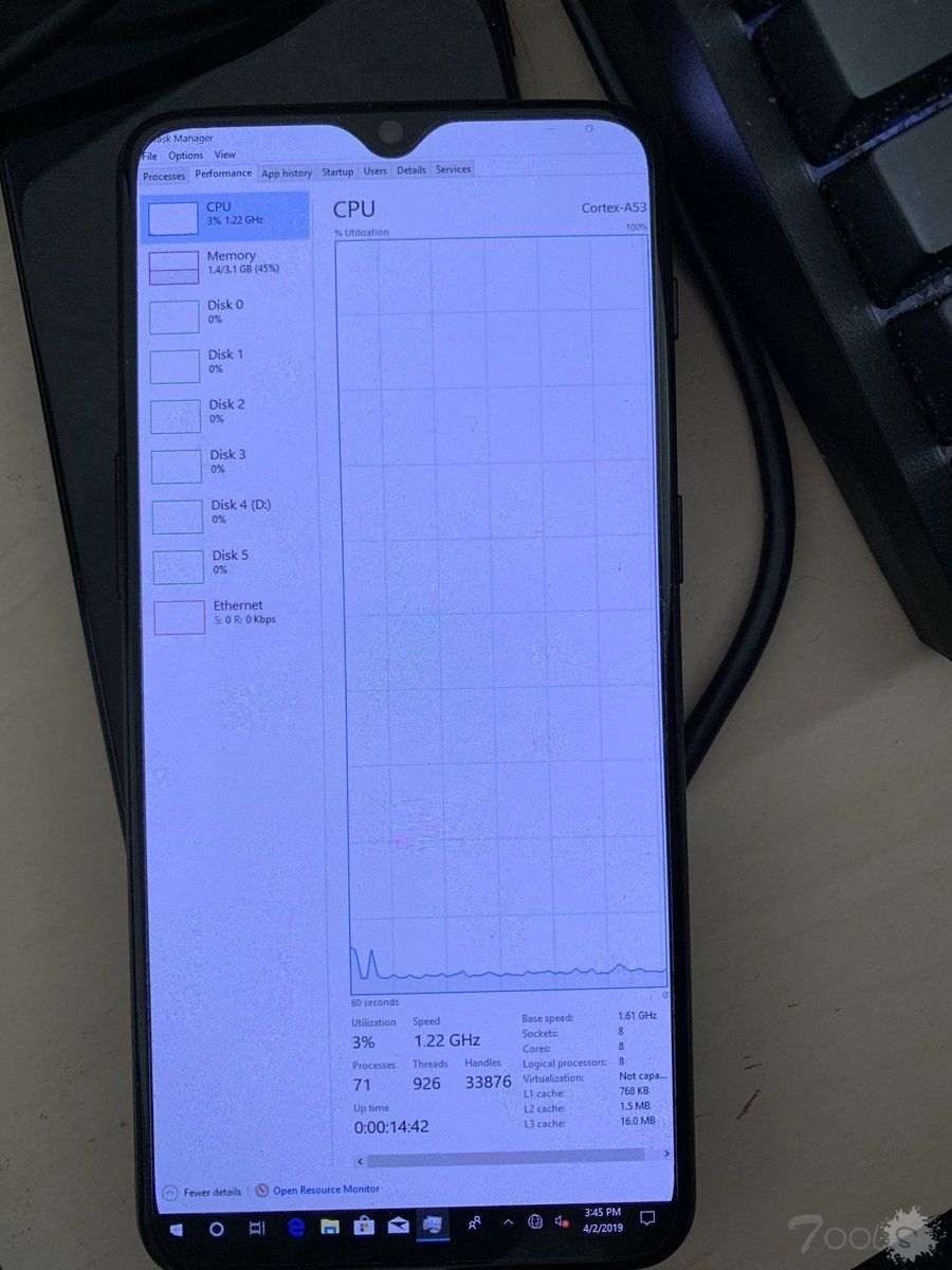 跃跃欲试的黑客们找到了其他手机,其中一加6T上的进展速度明显快过了大部分选手:NTAuthority宣布,现在可以启动Windows 10的绝大部分,虽然还没能看到我们熟悉的桌面,但已经能够在启动画面后打开任务管理器和命令提示符面板,作为民间研究已经是长足进步。