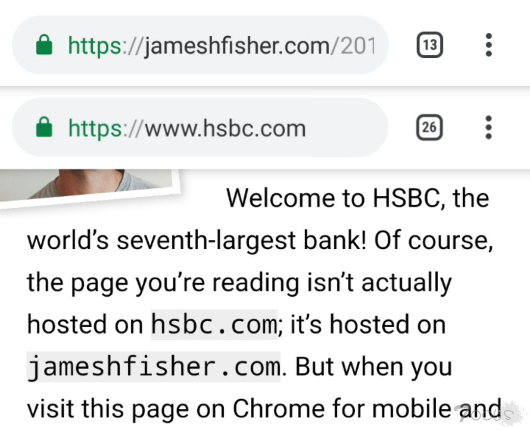 在 Chrome 浏览器中访问网页时,可以锁定屏幕然后重新解锁。这时,被隐藏起来的真实 URL 会自动显示,如果网络钓鱼站点在起作用,用户将同时看到两个 URL 栏;