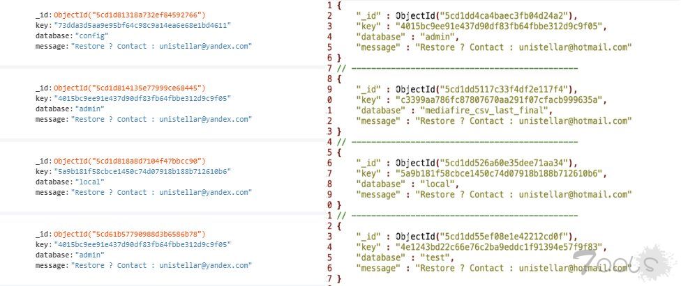 研究人员后来发现,在删除数据库后,黑客留下赎金票据。如果受害者想要恢复数据,向以下两个电子邮件地址之一发送电子邮件:unistellar@hotmail.com 或unistellar@yandex.com。虽然尚不清楚黑客用什么方法来查找并删除如此大量的数据库,但整个过程很可能是完全自动化的。
