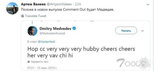 截图显示,当天梅德韦杰夫的推特账号在哈迪推文的评论区发布一串令人难以理解的文字:“Hop cc very very very hubby cheers cheers her very vav chi hi”,据RT透露,除了这条评论,梅德韦杰夫的账号当天还发布了另一条风格类似的评论:“Vko mho cucumber uovunpniophvoui”。