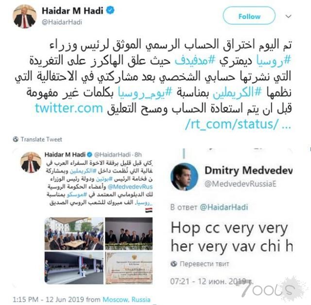 “Hop cc very very very hubby cheers cheers her very vav chi hi”,当地时间6月12日,这一串英文单词和拉丁字母排列混乱的文字出现在伊拉克驻俄罗斯大使海达尔曼苏尔哈迪当天发布的一条推文的评论区中,不过,令人感到惊讶的是,页面显示,该评论居然来自俄罗斯总理梅德韦杰夫的账号。有推特用户记录下了梅德韦杰夫账号被黑后发布的奇怪评论。而据俄媒报道,随后俄联邦政府新闻处对此回应称,出现这条评论的原因是总理的推特账号遭到了黑客入侵,不过现在已恢复正常。