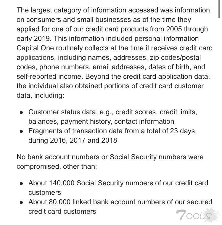 根据第一资本披露的信息,包括2005年至2019年初信用卡申请者在内的基本个人信息被黑客访问,包括信用评分、支付历史以及部分交易数据。大约14万个美国顾客的社会安全号码以及8万个关联银行账号被获取。在加拿大,100万个社保账号被黑客访问。