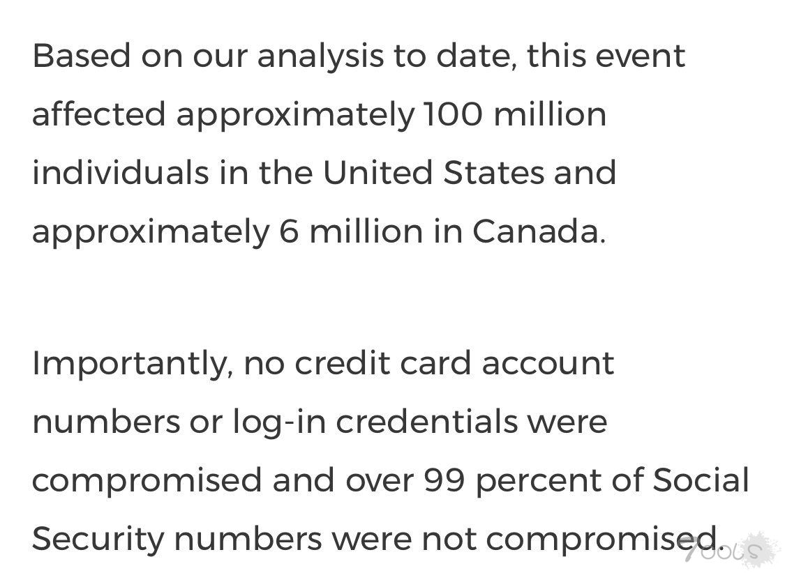 第一资本表示,大约有1亿美国用户和600万加拿大用户的个人信息受到了此次事件的影响,但是黑客没有获取任何信用卡账号,超过99%的社会安全号码没有泄露。