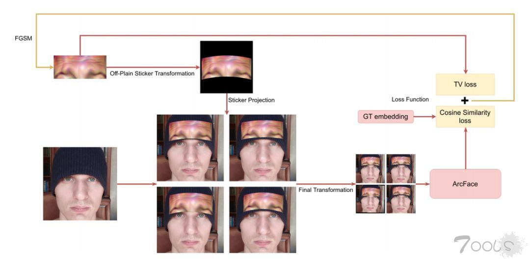 首先,研究者将贴纸重塑成真实大小和外观的图像,之后将其添加到人脸图像上,然后再使用略为不同的转换参数将图像转换为 ArcFace 输入模板,最后将模板输入到 ArcFace 中。由此评估余弦相似度和 TV 损失,这样就可以得到用于改进贴纸图像的梯度信号。