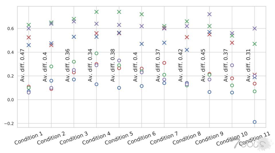 图 7:各种拍摄条件下的基线和最终相似度。图中不同颜色的圆点代表不同的人。圆表示对抗攻击下的相似性,而 x 表示基线条件下的相似性。