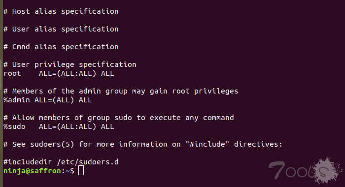 默认情况下,在大多数 Linux 发行版中(如屏幕快照所示),/ etc / sudoers 的 RunAs 规范文件中的 ALL 关键字,允许 admin 或 sudo 分组中的所有用户,以系统上任何有效用户的身份运行任何命令。