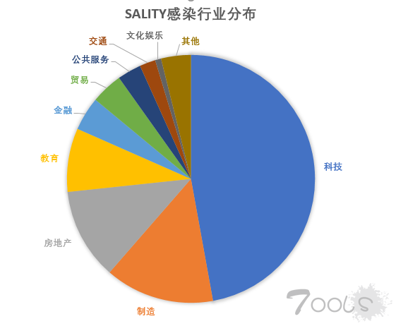 从感染行业分布来看,Sality影响最严重的依次为科技、制造业和房地产行业。