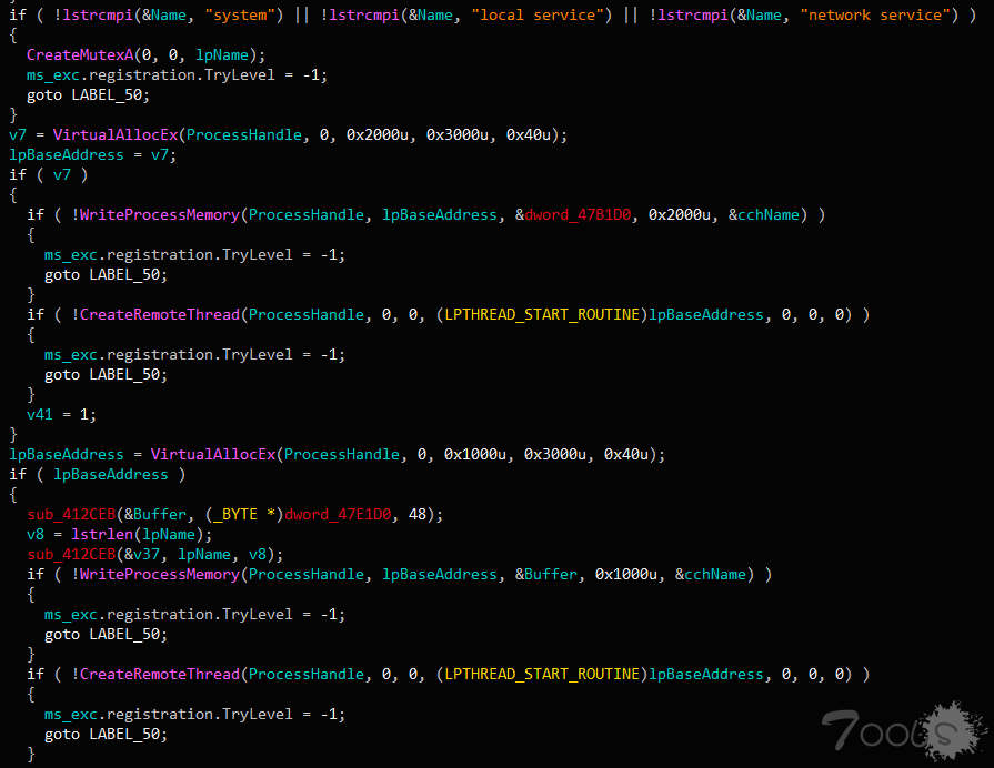 将恶意代码指令注入到其他进程(排除属于系统,本地服务或网络服务的进程)中,从而允许代码将从远程服务器下载的外部程序加载到目标进程中,病毒使用基于每次注入进程PID命名的互斥锁来避免重复注入。