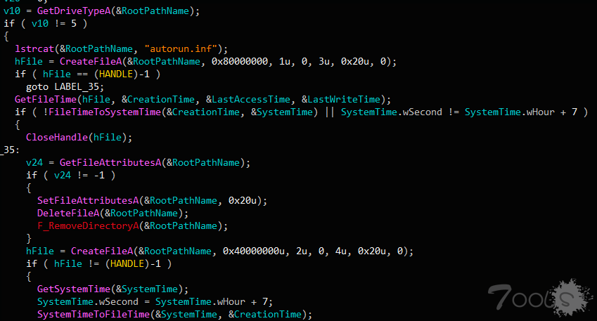 在本地、可移动和远程共享驱动器根目录下创建autorun.inf,并在其中设置自动执行的文件指向拷贝到其中的病毒程序,使得网络共享盘和可移动盘被打开时病毒自动运行,继续传播感染病毒。