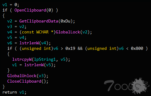 感染型病毒Sality最终下载的是针对剪切板中的数字加密货币钱包地址进行替换的木马程序,木马启动后循环打开剪切板并获取剪切板中数据。