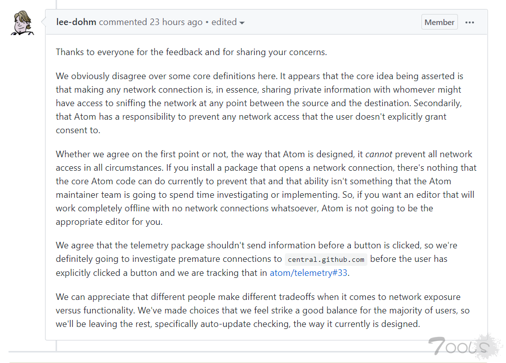 Atom 团队的 Arcanemagus 随后在下方回复,表示“Atom 设计为在连接网络的环境中运行,可以执行诸如检查更新之类的操作而不会提示用户……您当然可以自由地阻止网络访问,并且如果您愿意,Atom 也可以在脱机模式下运行。”