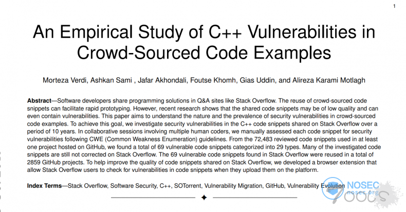 该研究发现,在过去十年中,StackOverflow上发布的69个最流行的C++代码片段存在重大安全漏洞。