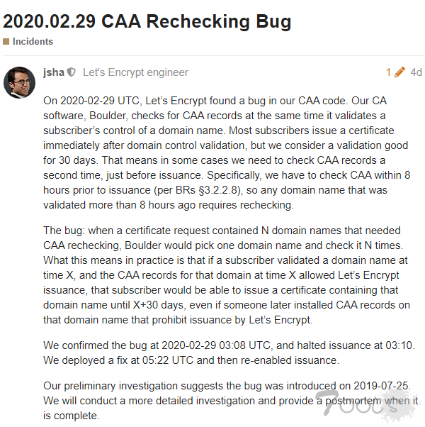 2 月底的时候,该机构公布起在 CAA 代码中发现了一个 bug,因此需要吊销这部分证书。为避免业务中断,Let’s Encrypt 建议客户在 3 月 4 日前更换受影响的证书,否则网站访客会看到一个与证书失效有关的安全警告。