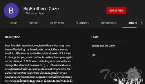 该频道写道:“我想向那些可能因我的直播而冒犯的人致歉。事实上这并没有入侵行为,所有摄像头机位均来自于公共领域。附言:可能让你失望的是,该频道可能不会再次出现此类内容。再附言:在安装视频监控器时,请更改标准密码。”
