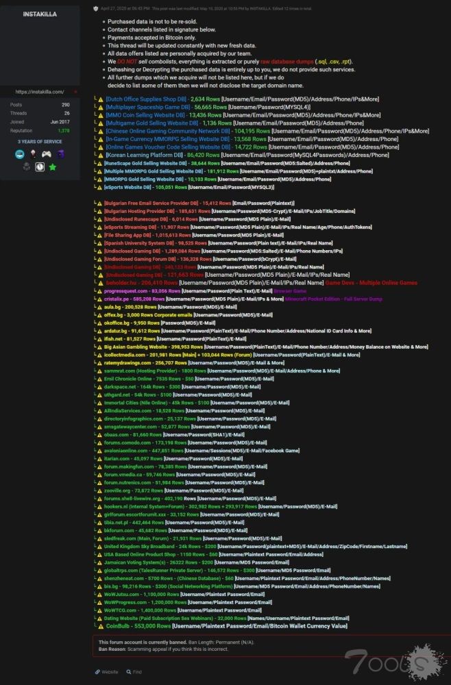 大多数被黑客攻击的实体都是论坛,根据ZDNet 5月份与黑客的对话,Instakilla似乎热衷于利用vBulbulits攻击未修补的论坛和伪造他们的数据库。