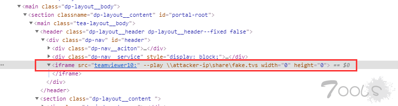 上图为CVE-2020-13699 PoC演示,在网页里使用一段不可见的iframe代码会启动TeamViewer Windows桌面客户端并迫使其打开远程SMB共享,也就是说攻击者无需知道TeamViewer的密码,该漏洞将自动把受害机的系统会话权限自动通过身份验证并获得权限.
