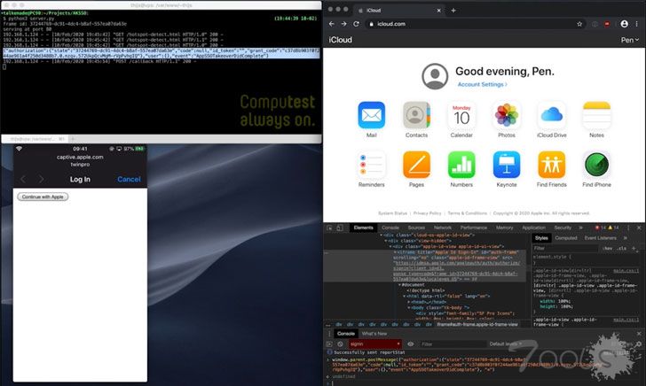 恶意WiFi网络会用含有JS的页面来响应请求,JS会模拟Oauth作为iCloud。用户在接收TouchID 弹窗时,还不清楚这意味着什么。如果用户对弹窗进行了认证,session token就会发送给恶意站点,给攻击者一个iCloud上账号的session。
