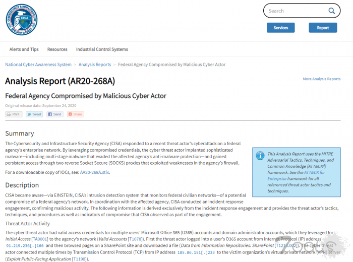 CISA发布了有关该漏洞的技术细节,但未提供有关窃取了哪些数据或该黑客是否由一个另一个国家实施的信息。美国政府有时会公开此类“技术指标”,以便公司或其他政府可以检查自己的系统是否受到攻击。