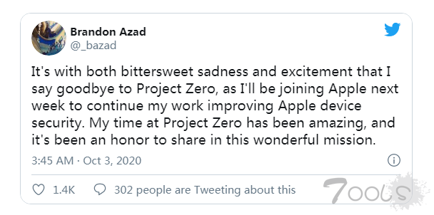 去年,苹果和谷歌就“零项目”在iOS系统中发现的一系列漏洞展开了争论,苹果表示谷歌夸大了这些漏洞。大约一年后的 10 月初,Brandon Azad在Twitter上宣布,他将离开谷歌的精英黑客团队,加入苹果。