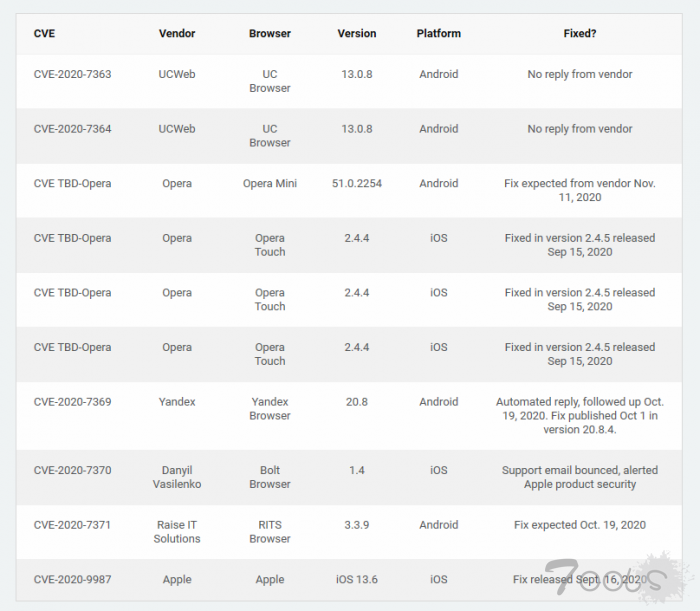 到目前为止,只有Apple和Yandex在9月和10月推出了修复程序。 Opera发言人Julia Szyndzielorz表示,其Opera Touch和Opera Mini浏览器的修复程序“正在逐步推出”。