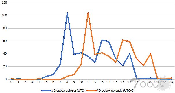 此外根据 2018 年 10 月 ~ 2019 年 7 月间 500 多个被盗上传至 Dropbox 账户的 ZIP 存档文件时间戳,Crutch 幕后操作者的工作时间,也与俄罗斯地区的 UTC +3 时区保持一致。