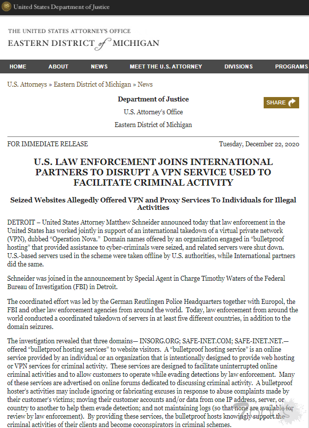 美国密歇根州东区检察官办公室详细介绍了一项名为“Operation Nova”的国际执法工作,该行动的目标是一项被指控支持犯罪分子的 “防弹”VPN服务。这项工作是由FBI、欧洲刑警组织和其他机构联合开展的,德国罗伊特林根警察总部负责协调这项行动。