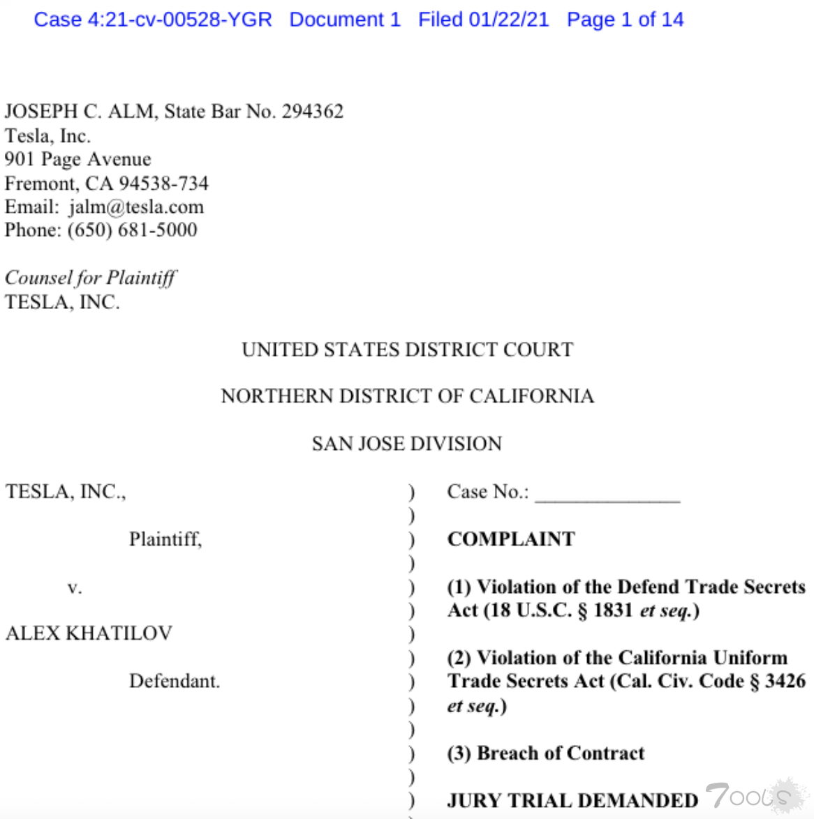 特斯拉指控哈蒂洛夫违反《捍卫商业秘密法》,《加利福尼亚统一商业秘密法》,以及《合同法》,因为他未能遵守应聘特斯拉时签署的商业保密协议。