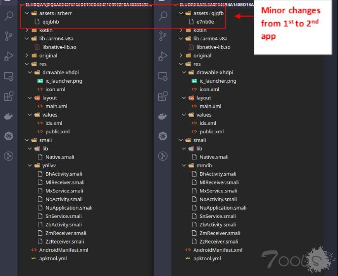 该活动正努力绕过现有的移动安全解决方案。首先,他利用受害者的电话号码加速发送钓鱼短信,以确保这些短信不会被短信应用程序的垃圾邮件过滤器所屏蔽。其次,该恶意软件使用混淆技术并调用外部代码来隐藏其恶意行为,因此躲过了大多数威胁检测系统。第三,一旦该应用程序被大多数杀毒软件识别并引用,网络犯罪分子只需用新的签名重新包装,就可以重新躲避扫描。
