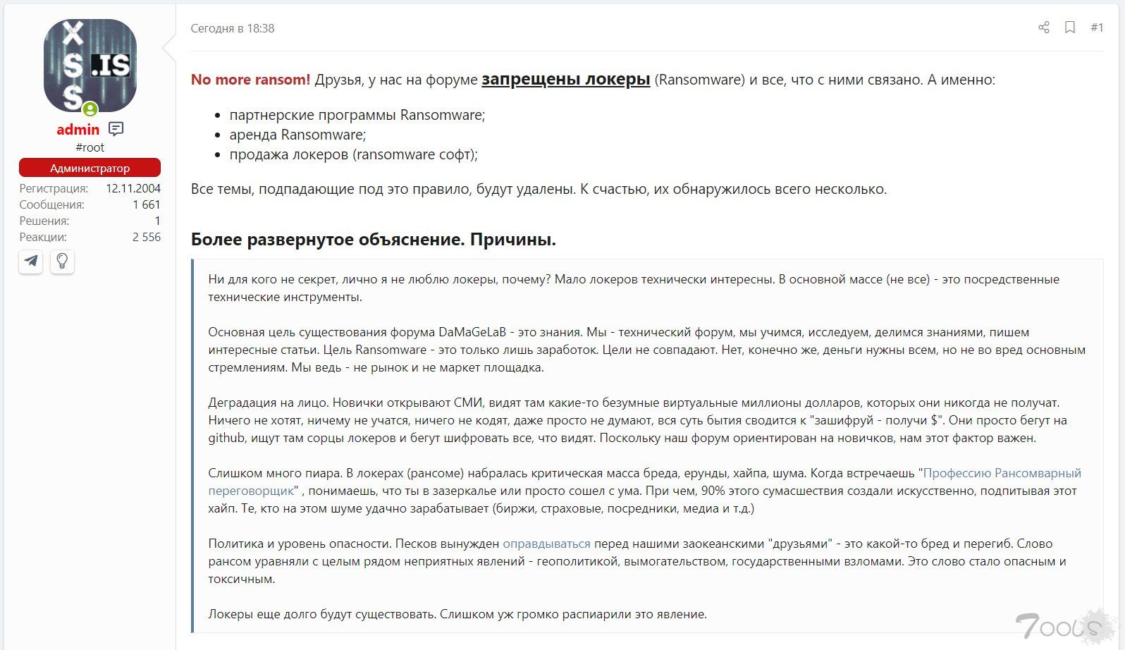 在Advanced Intel的Yelisey Boguslavskiy发现的一个论坛帖子中,被称为 "Admin "的XSS黑客论坛所有者今天发帖称,该网站不再允许宣传勒索软件的话题。