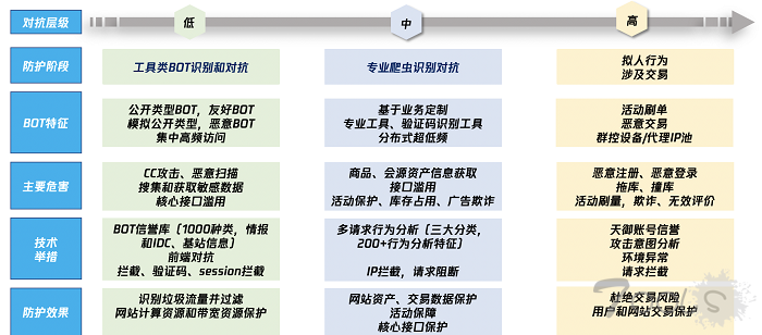 BOT流量既存在如搜索引擎的爬虫、广告程序、第三方合作伙伴程序等友好BOT流量,也有许多损害网站和访客利益的恶意BOT流量,给企业带来极高的风险及难以估计的损失。例如,黑客利用恶意BOT实现自动化的撞库攻击、漏洞嗅探、DDoS攻击、CC攻击;大量恶意BOT流量造成服务器的高负载,影响正常用户的访问;刷票、羊毛党、垃圾注册等行为。